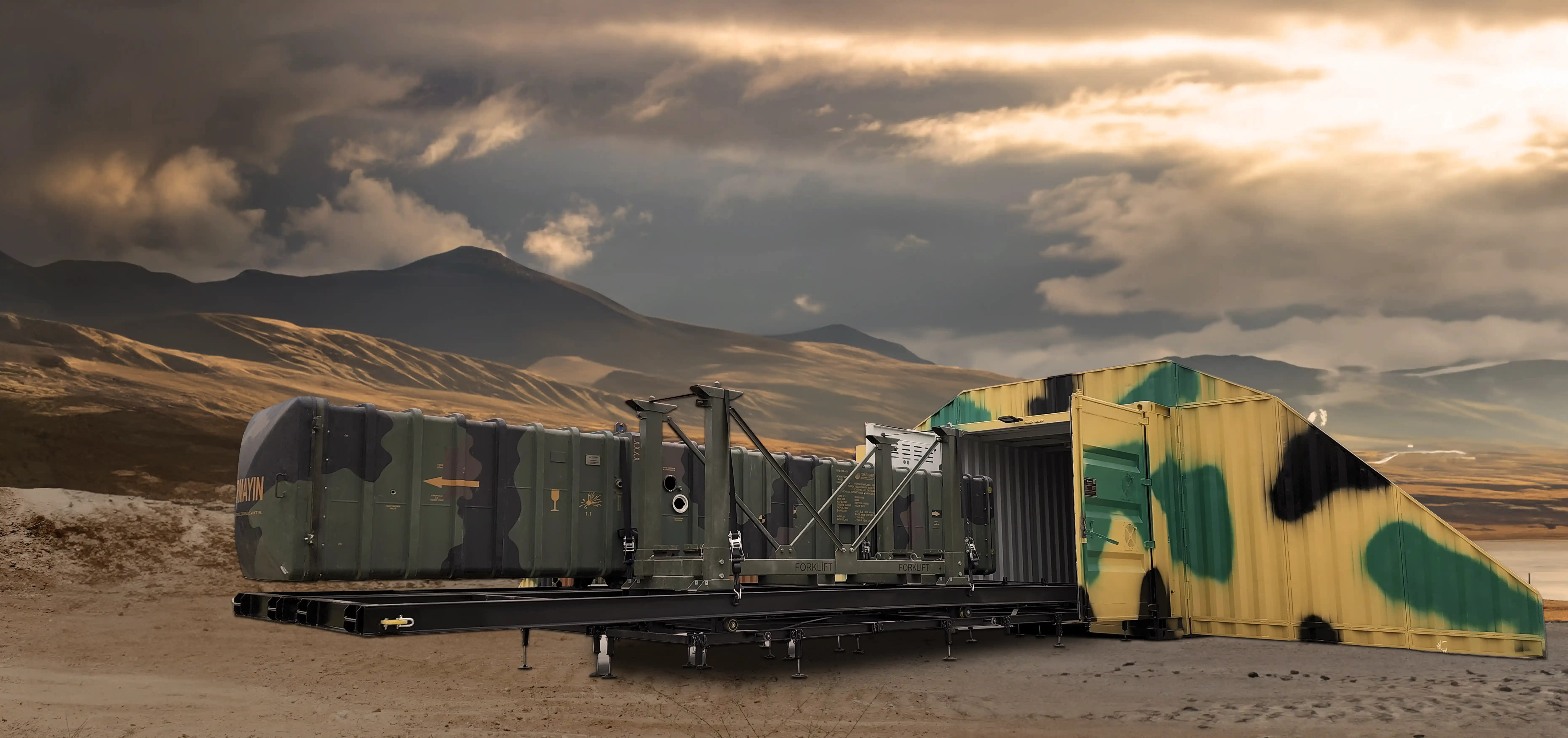 Roket taşıyıcı platformlar; roket, füze ve benzeri mühimmatların depolanması, taşınması ve operasyon alanına sevk edilmesi süreçlerinde güvenilir bir altyapı sağlar. Yüksek mukavemetli çelik konstrüksiyon yapısı sayesinde ağır yük taşıma kapasitesine sahip olan sistemler, zorlu saha koşullarında uzun süreli kullanım için tasarlanmıştır.