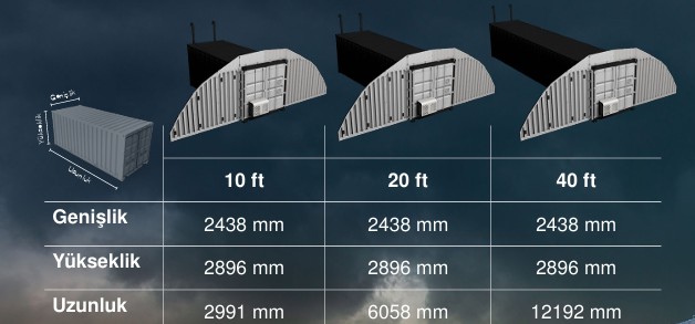 Modüler Toprak Örtülü Akıllı Mühimmat Depo’sunun uygun vasıtalar ile taşınabilmesi için ihtiyacınıza bağlı olarak 10, 20 ve 40 feet konteyner ebatlarında ürün yelpazesi sunmaktayız. Depolanacak mühimmat ve depolama alanınızın durumuna göre dilediğiniz Modüler Toprak Örtülü Akıllı Mühimmat Depo’yu seçebilirsiniz. Ayrıca Modüler Toprak Örtülü Akıllı Mühimmat Depo’nun kurulacağı araziye göre veya kendi tercihinize göre istediğiniz kamuflaj ya da diğer renkleri tercih edebilirsiniz.